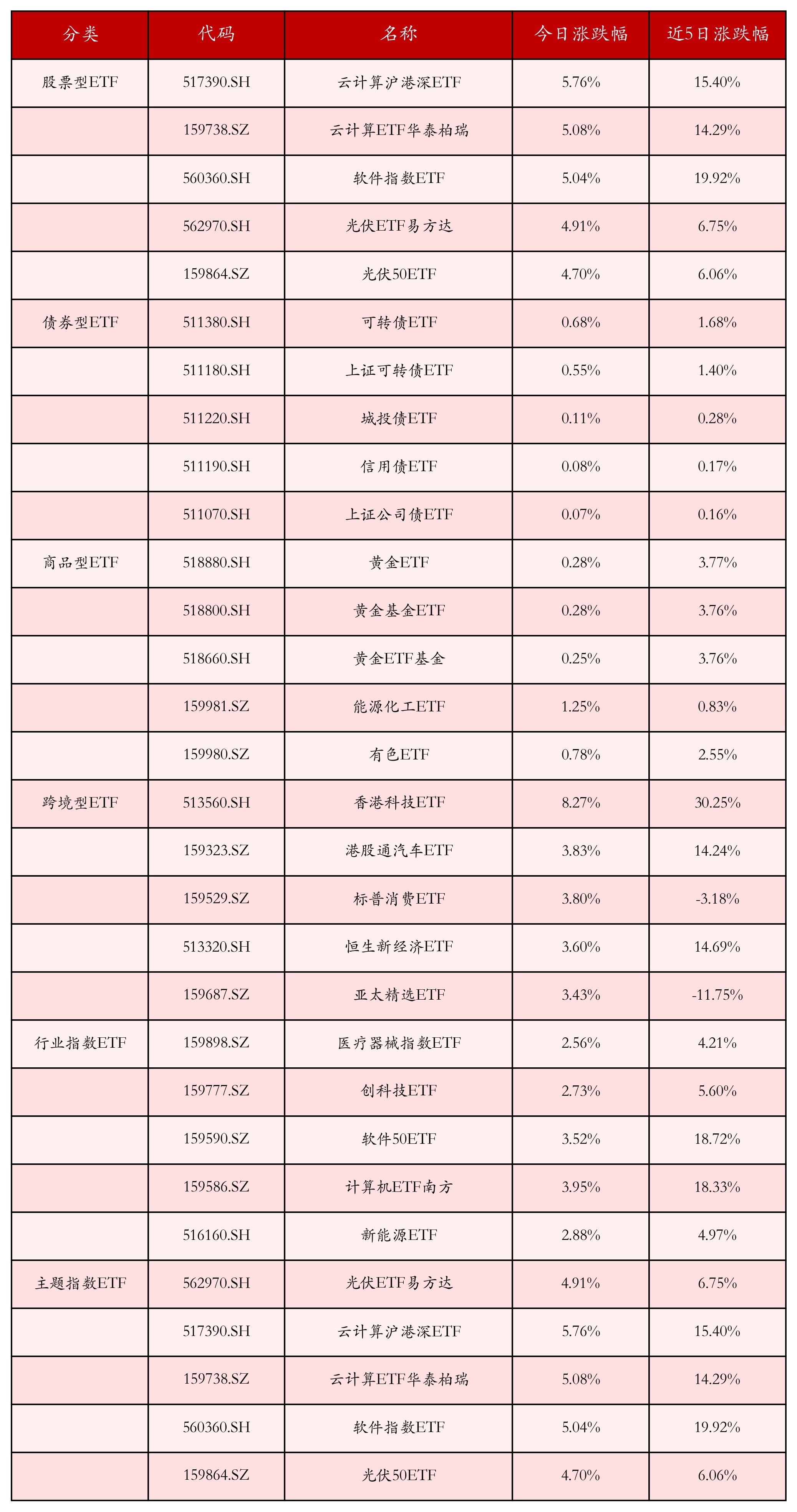 从不同投资种类、行业、主题的ETF产品中找出今日走势行情排名前5的ETF基金,今日涨幅靠前的ETF产品如下表所示。股票型ETF中涨跌幅排名前3位的ETF产品分别为云计算沪港深ETF(517390.SH)、云计算ETF华泰柏瑞(159738.SZ)和软件指数ETF(560360.SH),今日收益率分别为5.76%、5.08%和5.04%。