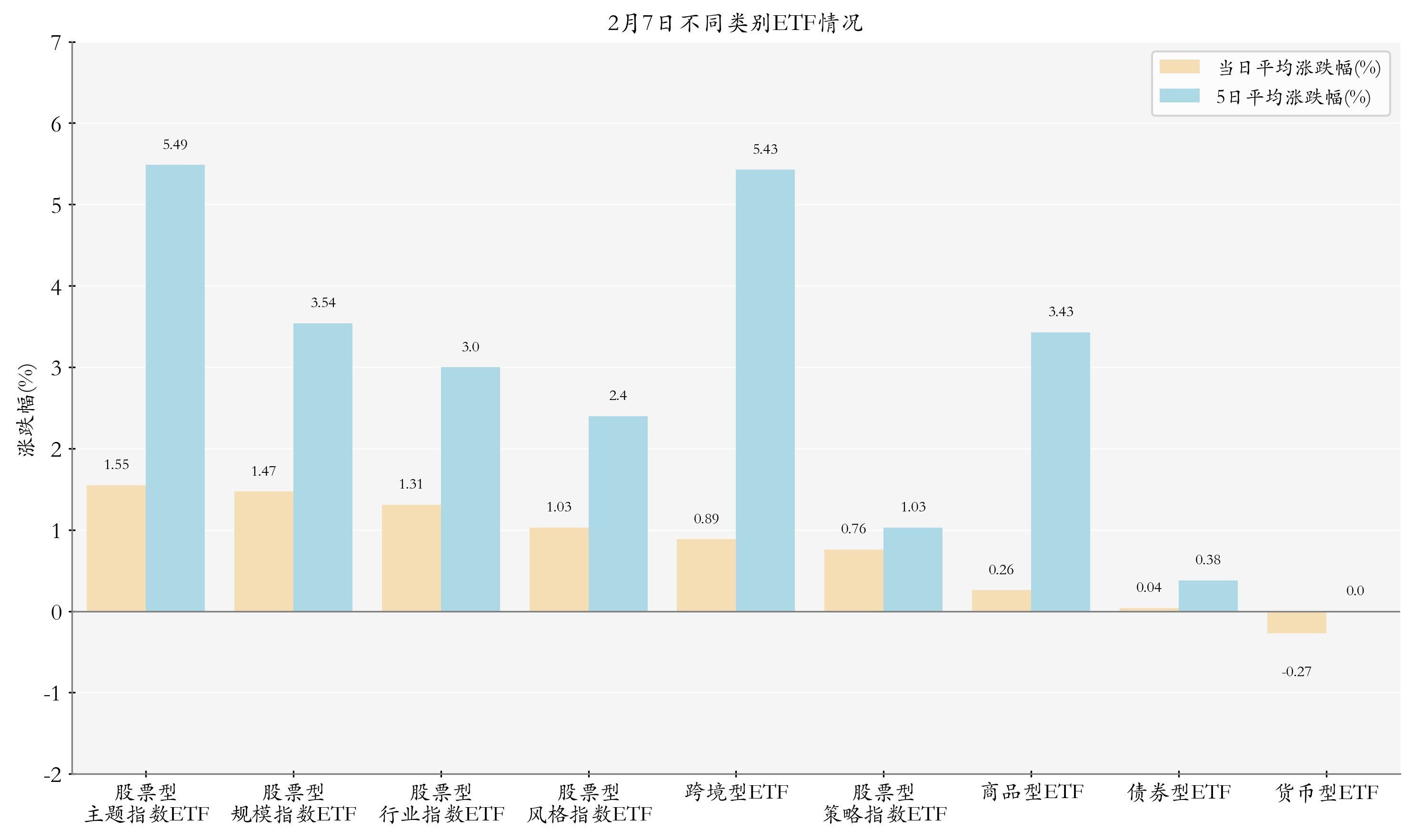根据ETF基金的投资范围,将ETF基金划分为股票型规模指数ETF、股票型行业指数ETF、股票型策略指数ETF、股票型风格指数ETF、股票型主题指数ETF、债券型ETF、商品型ETF、货币型ETF、跨境ETF,今日股票型主题指数ETF表现最优,该类ETF的平均涨跌幅为1.55%;货币型ETF的表现最差,该类ETF的平均涨跌幅为-0.27%。